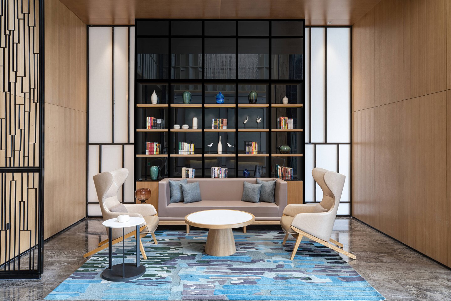 酒店大堂以简洁明快的装饰线条、多重质感的材质使用搭配现代风格的家具和灯饰,带来一种简单率真的体验感。