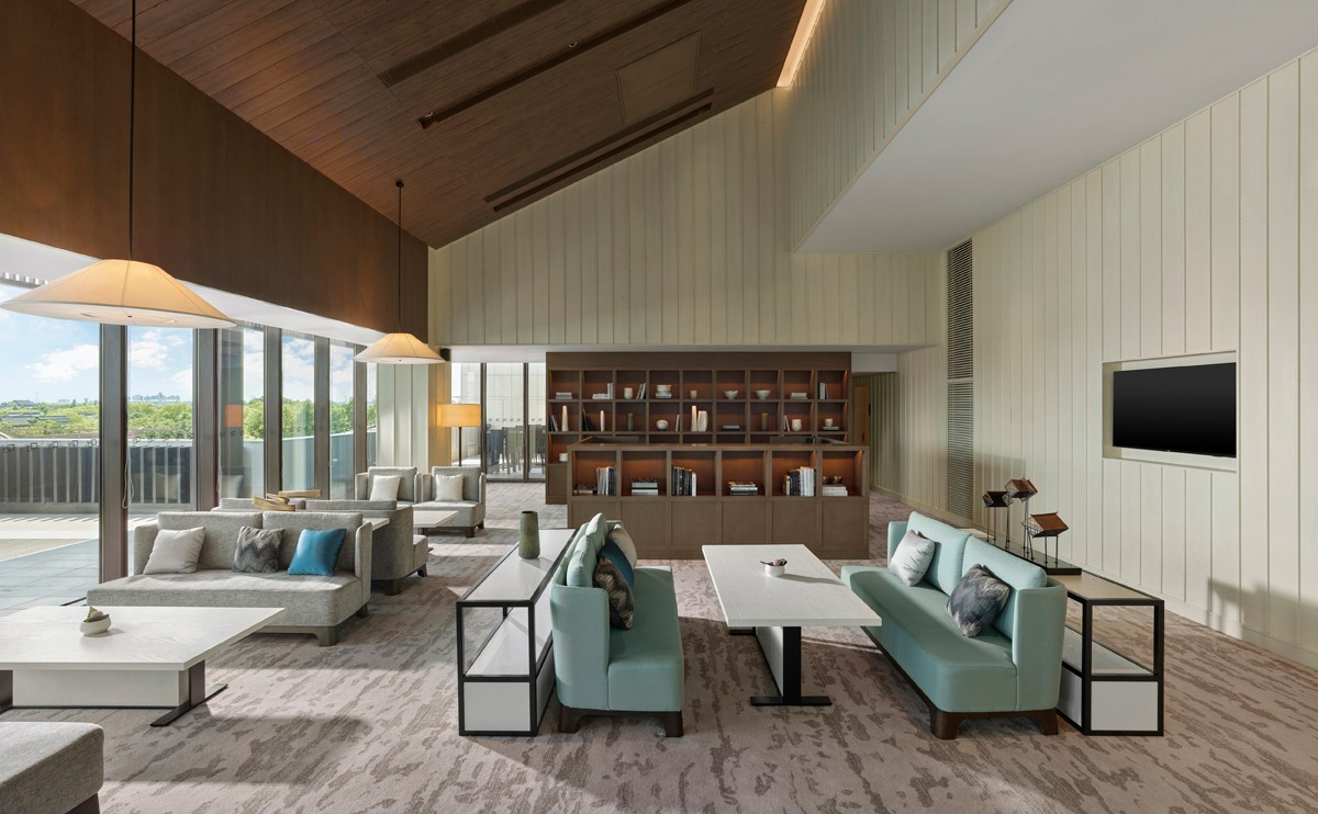 酒店以“水岸院居”的设计理念精心打造,主体建筑围绕两处园林布局,外揽富林湖光,内纳秀雅园林;室内设计更是深度融合了松江的文化肌理,以广富林文化为底色,演绎出古典与现代相结合的新中式建筑景观。