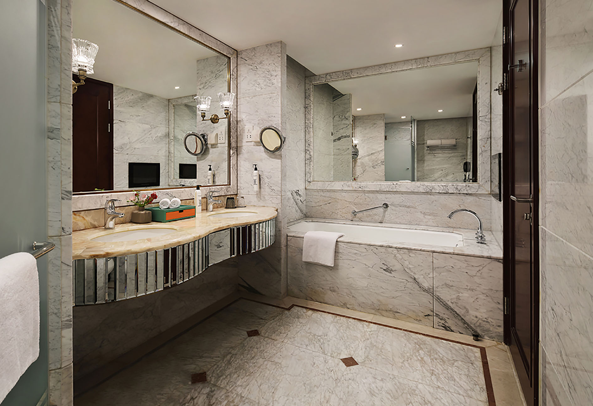 客房内配备玻璃隔离浴缸及独立淋浴间,卫生间干、湿分离,国际专业定制洗护用品配合热带雨林式沐浴体验。