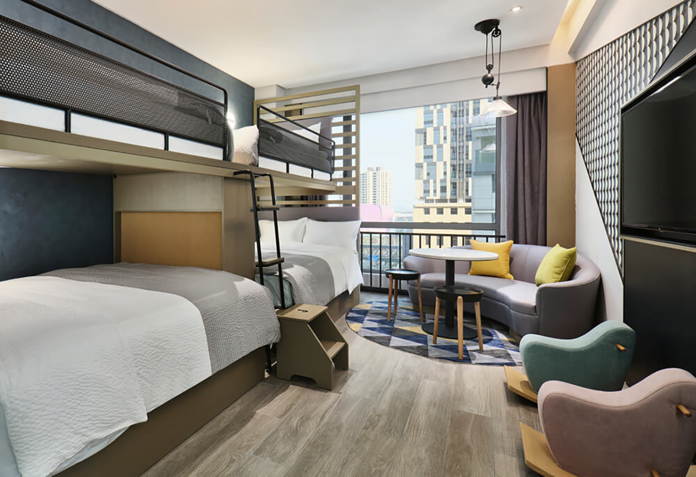 特色四人房位于酒店8层,面积29平米,配备特色高低床两张。