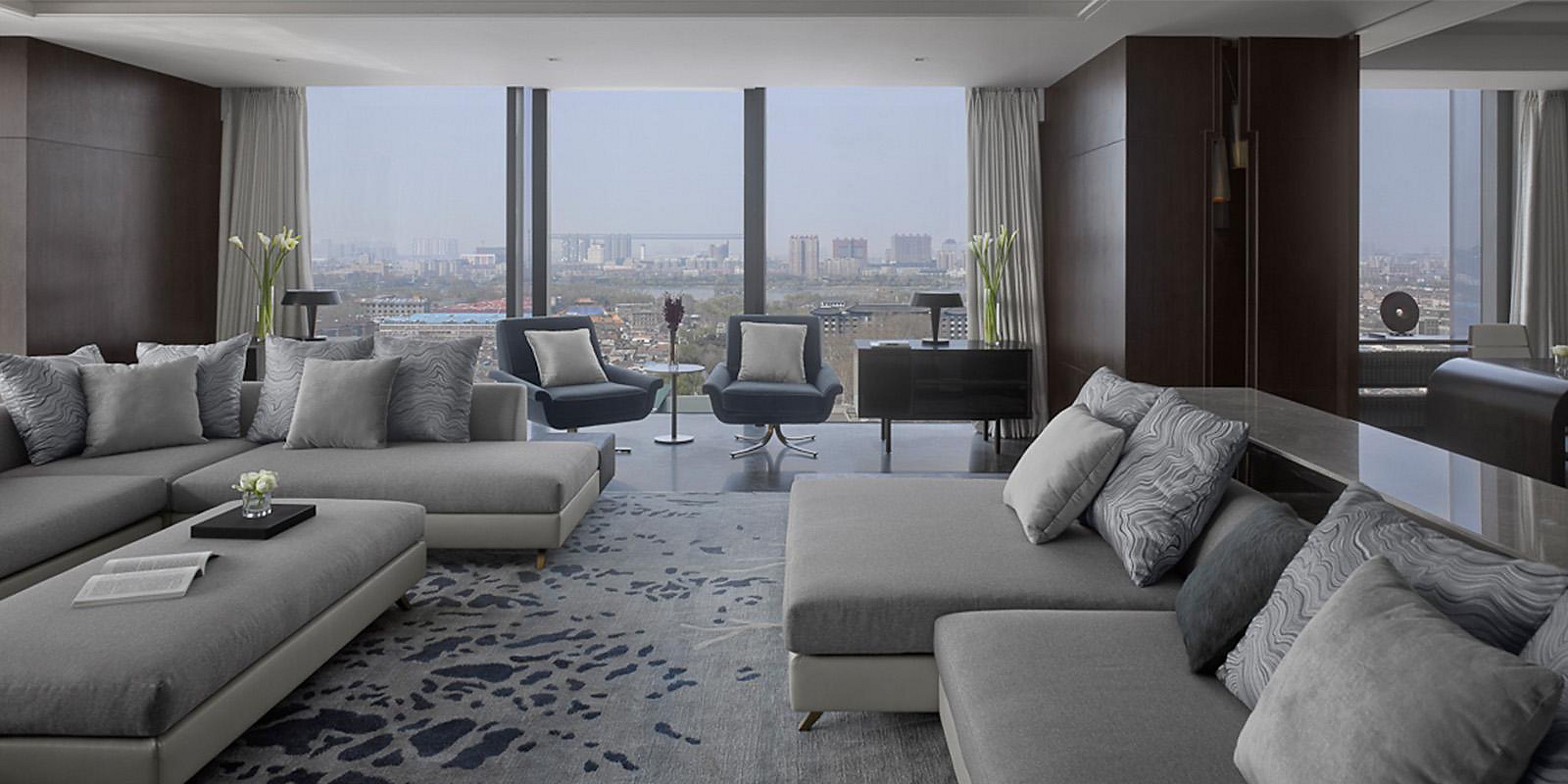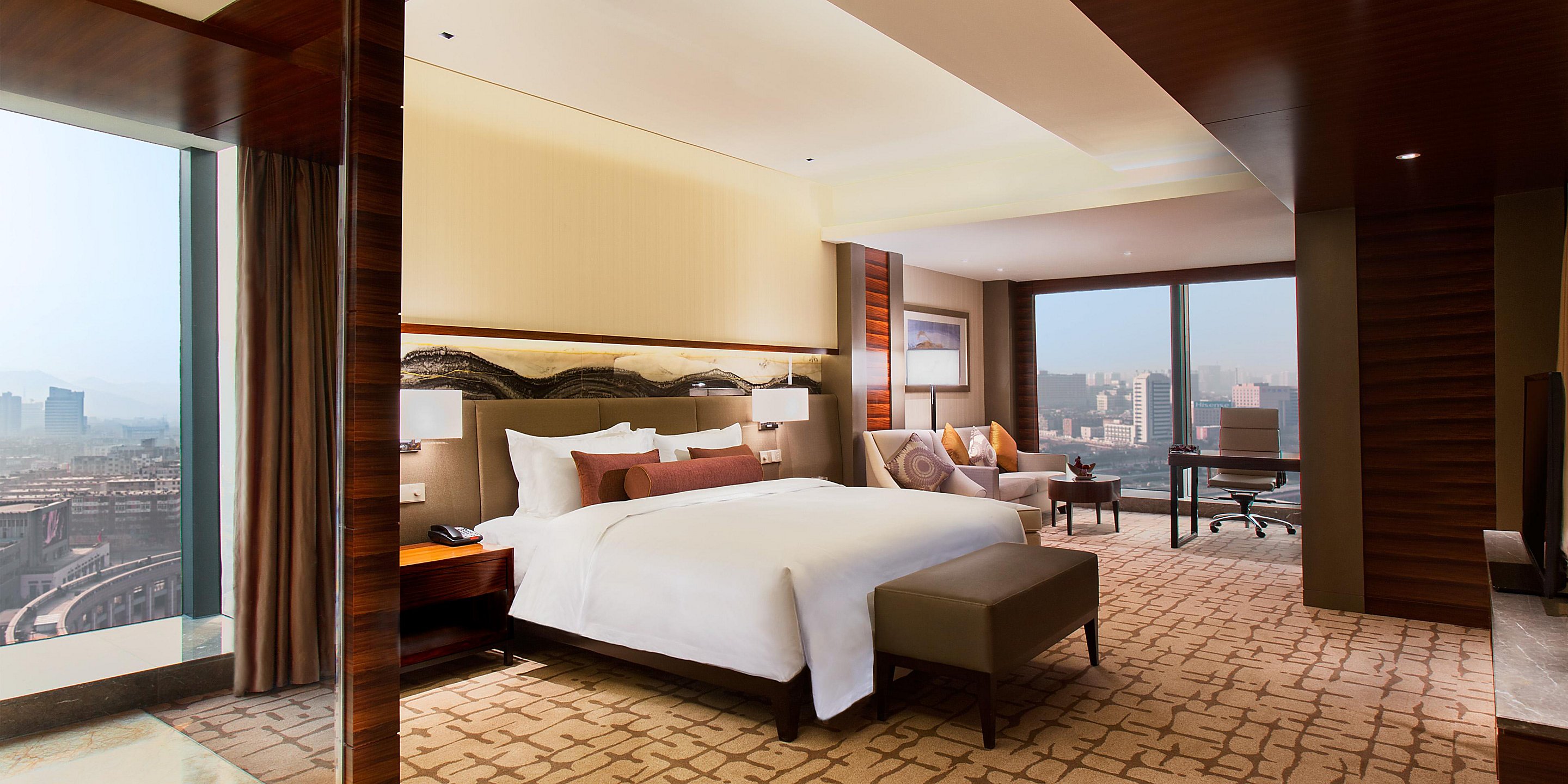 套房,在装饰精美的套房客厅与同事进行非正式会面。酒店大使套房内设豪华中式客厅,透过窗外即可观赏秀丽的泉城风光和葱葱郁郁的高山。