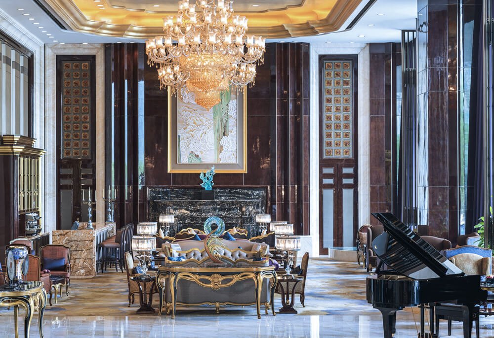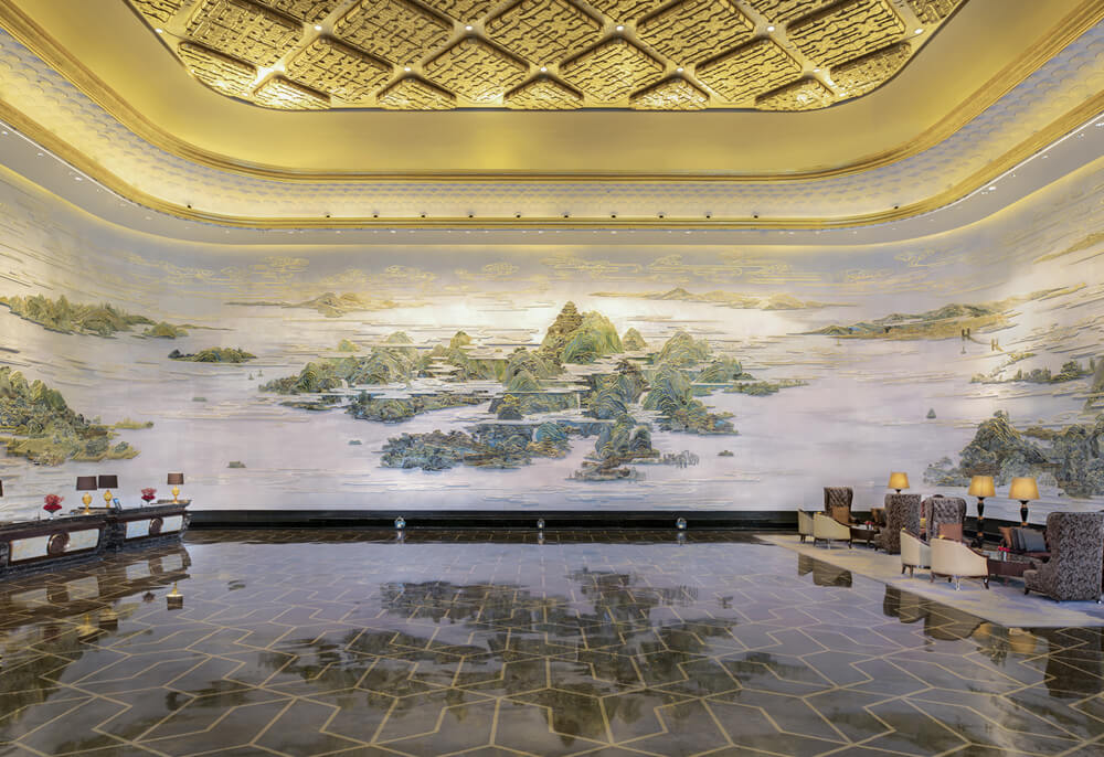 酒店大堂的主题浮雕壁画令人叹为观止,高10米、长60米,其设计灵感来源于武汉东湖的八大盛景,以汉白玉、天然玉石、金丝等多种珍稀材质雕刻而成。