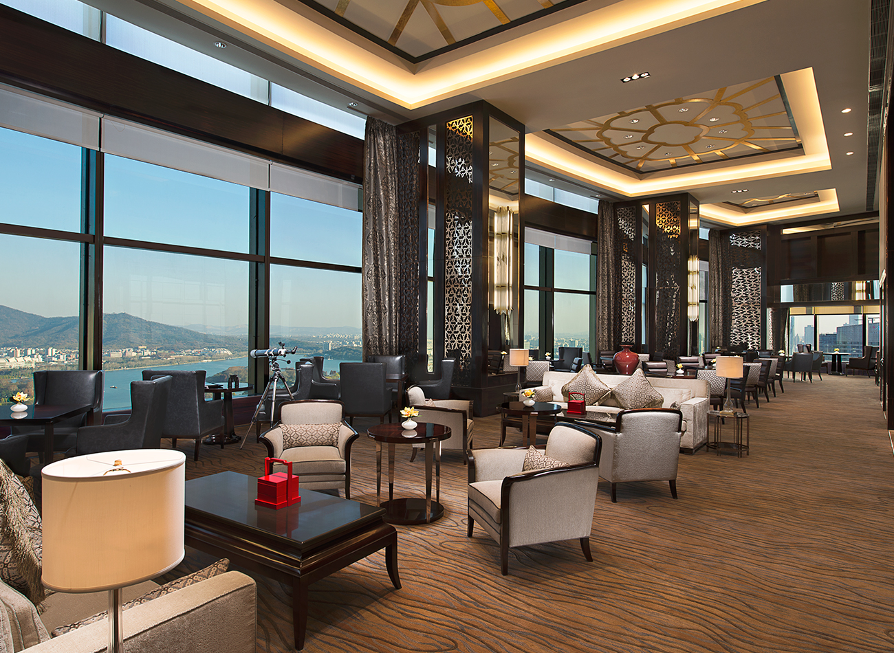 豪华阁贵宾廊,提供有美味的鸡尾酒,向窗外放眼望去,紫金山的无限美景尽收眼底,随着夕阳的徐徐降下,古都顿时变成了繁华的现代大都市。